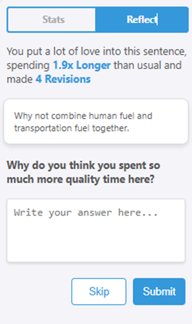 Initally, students were given data oriented reflection questions: “You wrote 3x faster on this sentence, why?” Teachers wanted more targeted questions they can assign, like “Help me use more action verbs.” This inspired us to integrate ChatGPT to help with student reflection, which, full circle, is not about plagerism detection.